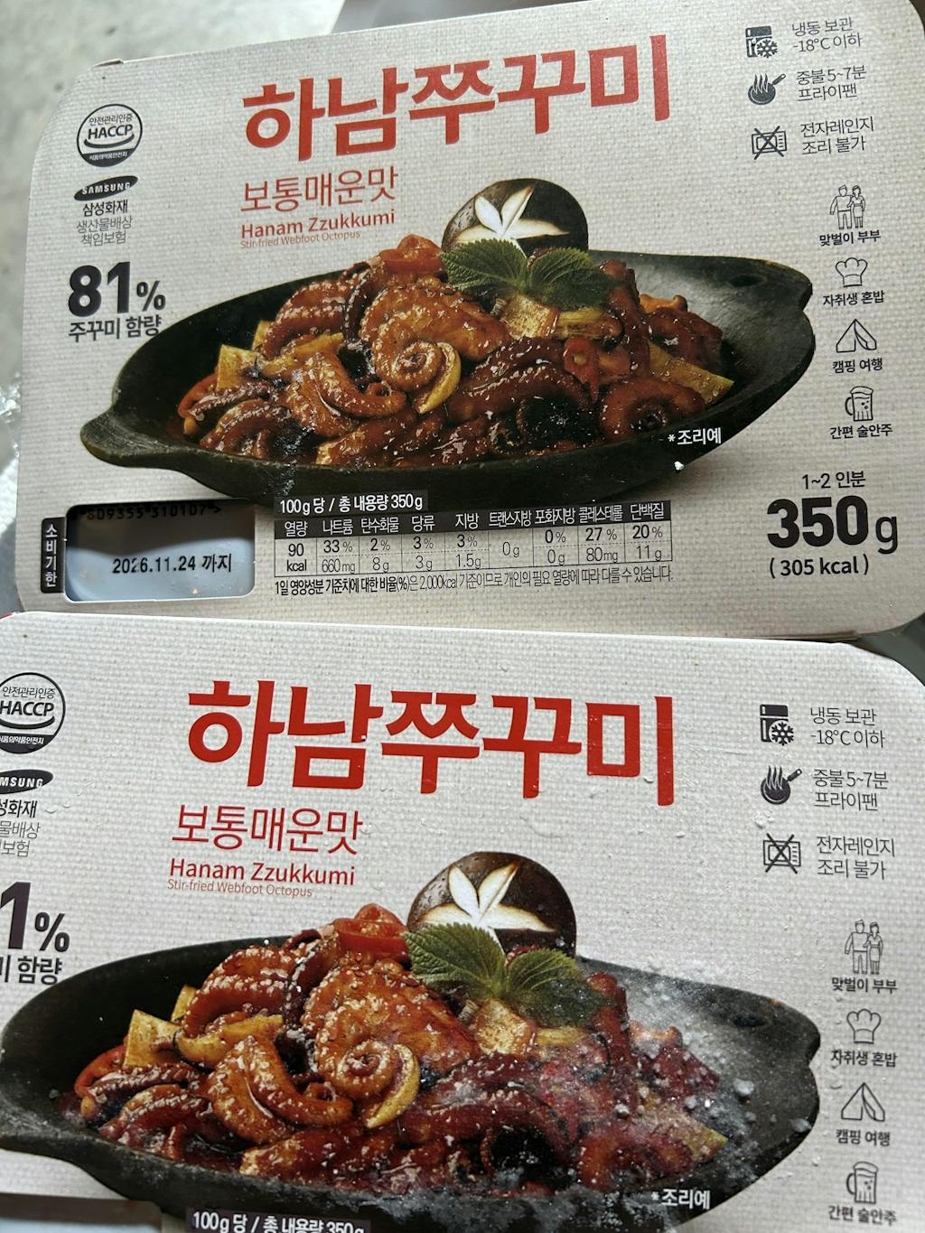 | 원재료명 | 쭈꾸미81%(외국산:베트남,태국,인도네시아등),고추장[된장{밀가루(밀:미국산,호주산)},물엿,향신료조제품1(중국산),향신료조제품2(중국산),정제소금(국산)],설탕,고춧가루:고추(중국산),마늘,향미유(식용유지),무,L-글루탐산나트륨(향미증진제),혼합간장,표고버섯분말,양파,볶음참깨가루,후춧가루 |