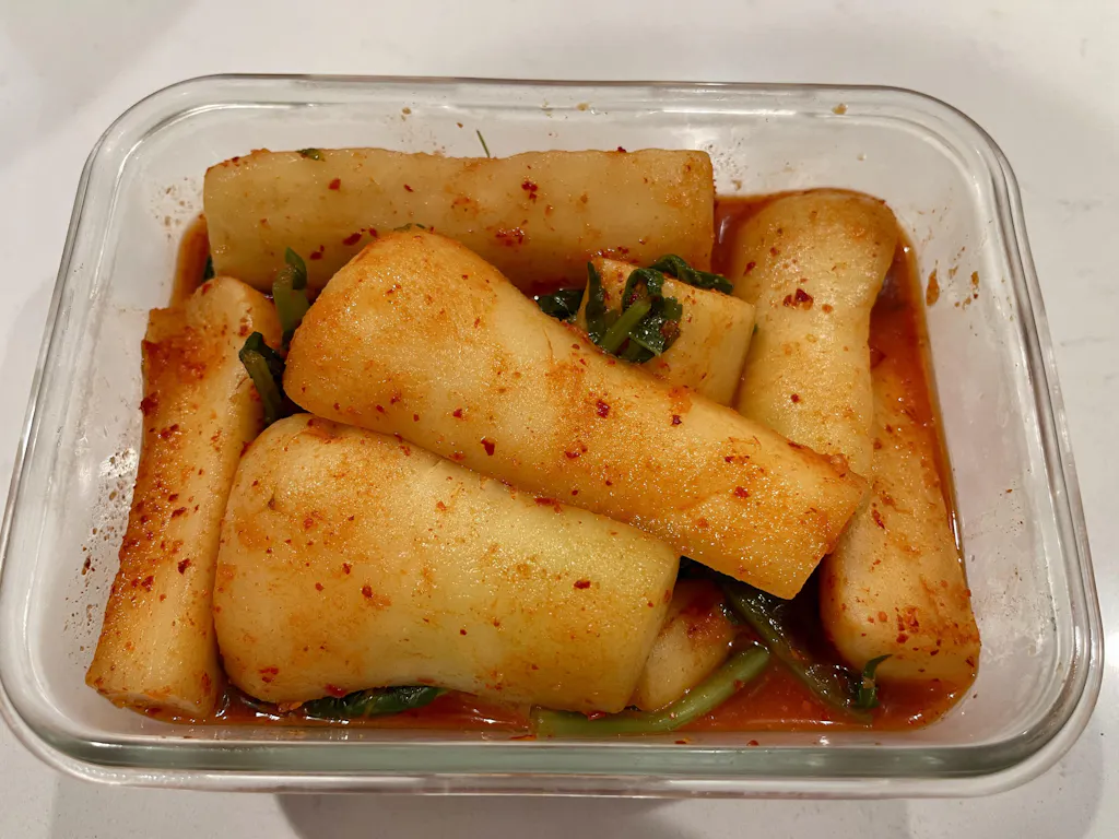 국내산 총각무를 사용해 아삭아삭한 식감이 살아있어요. 바로 먹어도 맛있고 숙성 후에도 무의 아삭함이 그대로 살아있어 언제나 맛있는 총각김치를 즐길 수 있어요.